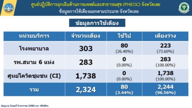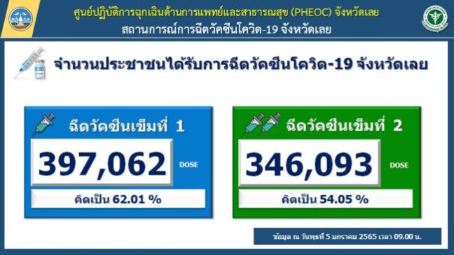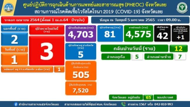 ศูนย์ปฏิบัติการถูกเฉินด้านการแพทย์และสาธารณสุข (PHEOC) จังหวัดเลย สถานการณ์โรคติดเชื้อไวรัสโคโรนา 2019 (COVID-19) จังหวัดเลย ข้อมูล ณ วันพุธที่ 5 มกราคม 2565 เวลา 09.00 น.ติดเชื้อรายใหม่ 3 รายเดินทางมาจากนอกพื้นที่ 2 ราย