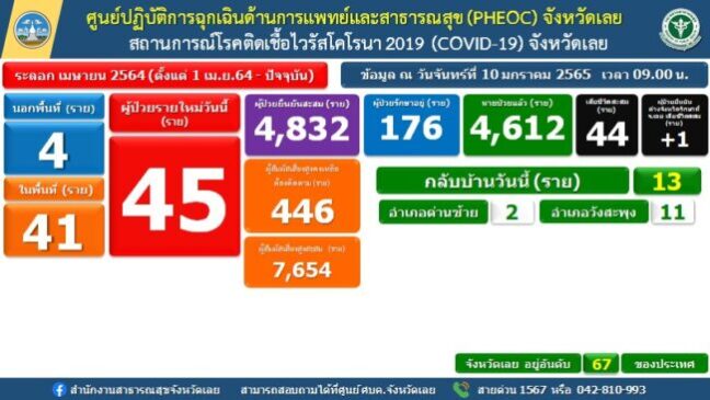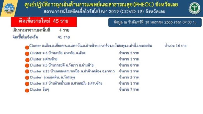 ศูนย์ปฏิบัติการถูกเฉินด้านการแพทย์และสาธารณสุข (PHEOC) จังหวัดเลย สถานการณ์โรคติดเชื้อไวรัสโคโรนา 2019 (COVID-19) จังหวัดเลย ติดเชื้อรายใหม่ 45 ราย ข้อมูล ณ วันจันทร์ที่ 10 มกราคม 2565 เวลา 09.00 น.