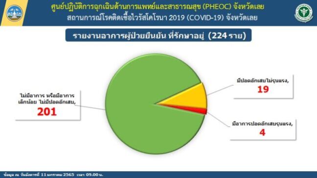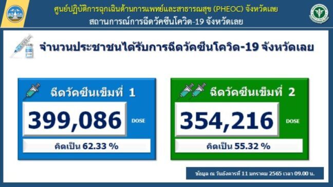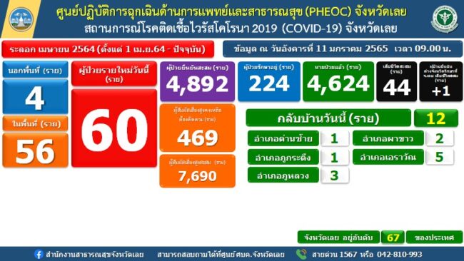ศูนย์ปฏิบัติการถูกเฉินด้านการแพทย์และสาธารณสุข (PHEOC) จังหวัดเลย สถานการณ์โรคติดเชื้อไวรัสโคโรนา 2019 (COVID-19) จังหวัดเลย ติดเชื้อรายใหม่ 60 ราย ข้อมูล ณ วันอังศารที่ 11 มกราคม 2565 เวลา 09.00 น. เดินทางมาจากนอกพื้นที่ 4 ราย ติดเชื้อในจังหวัด 56 ราย