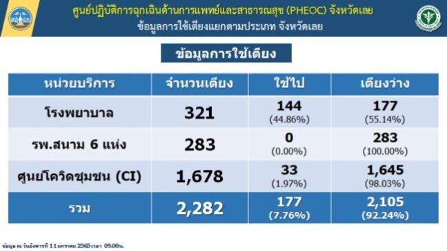 ส่วนการบริหารเตียงรักษาพยาบาล ใน รพ. 321 เตียง รพ.สนาม 283 เตึยง ศูนย์โควิดชุมชน 1,738 เตียง เหลือ 2,105 เตียง