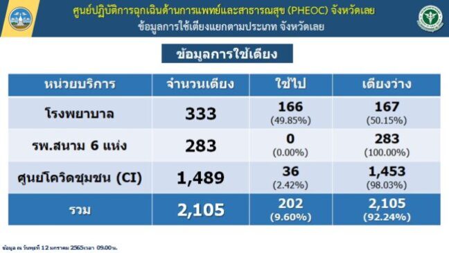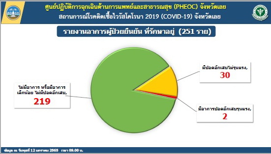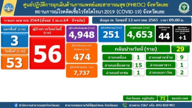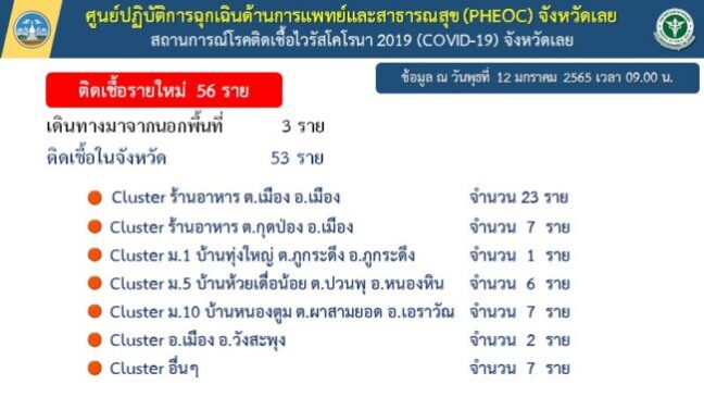 ศูนย์ปฏิบัติการถูกเฉินด้านการแพทย์และสาธารณสุข (PHEOC) จังหวัดเลย สถานการณ์โรคติดเชื้อไวรัสโคโรนา 2019 (COVID-19) จังหวัดเลย ติดเชื้อรายใหม่ 56 ราย ข้อมูล ณ วันพุธที่ 12 มกราคม 2565 เวลา 09.00 น.