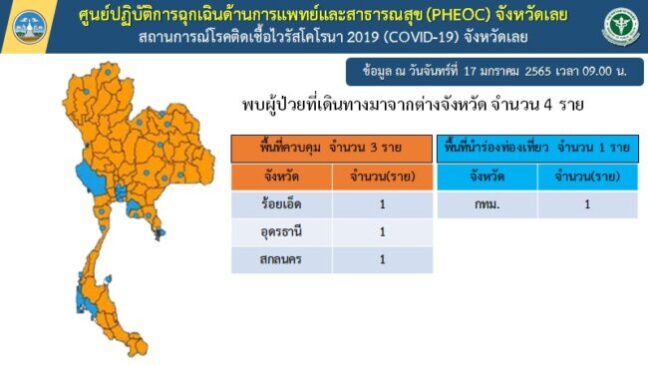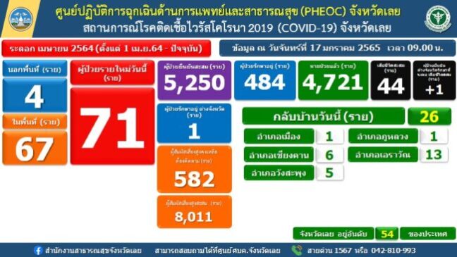 ศูนย์ปฏิบัติการถูกเฉินด้านการแพทย์และสาธารณสุข (PHEOC) จังหวัดเลย สถานการณ์โรคติดเชื้อไวรัสโคโรนา 2019 (COVID-19) จังหวัดเลย ติดเชื้อรายใหม่ 71 ราย ข้อมูล ณ วันจันทร์ที่ 17 มกราคม 2565 เวลา 09.00 น. เดินทางมาจากนอกพื้นที่ 4 ราย ติดเชื้อในจังหวัด 67 ราย