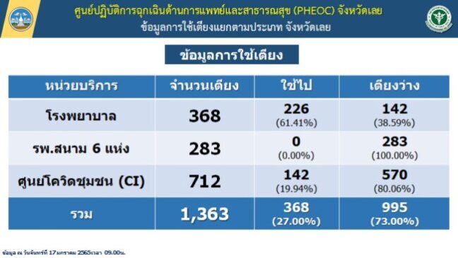 ส่วนการบริหารเตียงรักษาพยาบาล ใน รพ. 368 เตียง รพ.สนาม 283 เตึยง ศูนย์โควิดชุมชน 712 เตียง เหลือ 995 เตียง