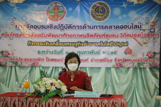 โดย นางศิวพร ฉั่วสวัสดิ์ ผวจ.หนองบัวลำภู กล่าวถึงสถานการณ์การแพร่ระบาดของโรคติดเชื้อไวรัสโคโรนา 2019 ส่งผลให้ระบบเศรษฐกิจของประเทศไทย และจังหวัดหนองบัวลำภู มีการซื้อจ่ายสินค้าและกำลังซื้อ สินค้าของผู้บริโภคลดลง การฝึกอบรมการตลาดออนไลน์ให้ผู้ประกอบการสินค้า otop เกษตรกร กลุ่มเกษตรกร กลุ่มวิสาหกิจชุมชน เพื่อพัฒนาศักยภาพ ปรับกลยุทธ์ด้านการตลาด ให้ธุรกิจอยู่รอด การนำเอาเทคโนโลยีเข้ามาใช้ในชีวิตประจำวัน จะทำให้สามารถใช้เครื่องมือในการสื่อสารช่องทางการจำหน่ายสินค้า online และ offline ให้สามารถเพิ่มช่องทางจำหน่าย สามารถสื่อสารข้อมูลทางการตลาดไปยังกลุ่มเป้าหมายได้อย่างรวดเร็วและทั่วถึง พร้อมทั้งสามารถแข่งขันทางการตลาด เพื่อให้ชุมชนสามารถเลี้ยงตนเองได้ ซึ่งจะนำไปสู่การพัฒนาที่ยั่งยืน