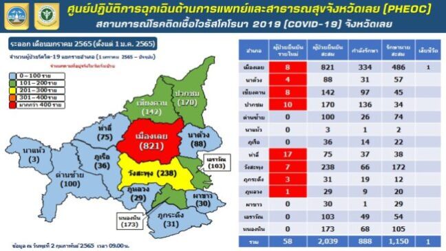 ศูนย์ปฏิบัติการฉุกเฉินด้านการแพทย์และสาธารณสุขจังหวัดเลย [PHEOC) สถานการณ์โรคติดเชื้อไวรัสโคโรนา 2019 (COVID-19) จังหวัดเลย ติดเชื้อรายใหม่ 58 ราย ข้อมูล ณ วันพุธ ที่ 2 กุมภาพันธ์ 2565 เวลา 09.00 น. เดินทางมาจากนอกพื้นที่ 6 ราย ติดเชื้อในจังหวัด 52 ราย