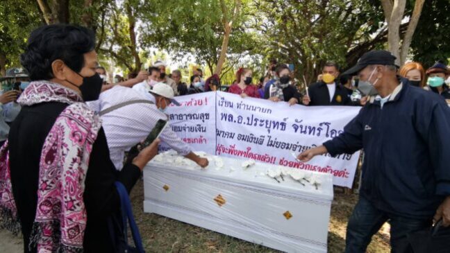 เมื่อเวลา 11.30 น. วันที่ 24 ก.พ. ที่บริเวณสนามหน้าศาลากลางจังหวัดศรีสะเกษ กลุ่มสมาชิกสมาคมฌาปนกิจสงเคราะห์ชมรมสาธารณสุขแห่งประเทศไทย (สชสท.) จำนวนกว่า 200 คน นำโดย น.ส.นุชนารถ ใยรักษ์ อายุ 35 ปี แกนนำร่วมชุมนุมประท้วงโดยการนำโลงศพมาวางดอกไม้จันทน์สาปแช่ง นายก สชสท. โดยกล่าวหาว่าอมเงินผี และให้คืนเงินทั้งหมดที่หักไปแก่สมาชิก