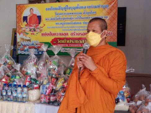 เมื่อวันที่ 9 มี.ค. ที่ศาลากลางหมู่บ้านดู่ หมู่ที่ 2 ต.ขุนหาญ อ.ขุนหาญ จ.ศรีสะเกษ พระครูธรรมธรสมพล ปัญญาพโล เจ้าอาวาสวัดป่าประชาสามัคคี นำศิษยานุศิษย์ จากกรุงเทพมหานคร และสาธุชนผู้ใจบุญจากทั่วประเทศ รวมถึงประเทศมาเลเซีย ร่วมกันทำบุญออนไลน์ นำสิ่งของ ประกอบด้วย ข้าวสาร อาหารแห้ง บะหมี่กึ่งสำเร็จรูป ปลากระป๋อง ไข่ไก่ เครื่องปรุงอาหาร ขนมขบเคี้ยว และน้ำดื่ม จำนวนกว่า 70 ชุด มามอบให้กับ นายบุญมี สำราญดี ผู้ใหญ่บ้านดู่ หมู่ที่ 2 ผู้นำชุมชน เพื่อเป็นกำลังใจและนำไปแจกจ่ายให้กับชาวบ้านที่ติดเชื้อโควิด-19 ซึ่งมีผู้ติดเชื้ออยู่จำนวนกว่า 70 คน และผู้สัมผัสเสี่ยงสูง อีกกว่า 100 คน ที่กักตัวอยู่แต่ภายในบ้าน