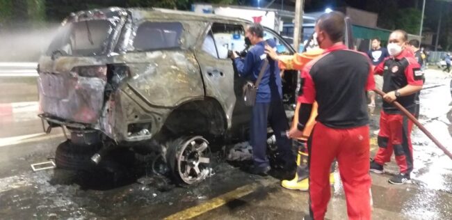เบื้องต้น จากการสอบสวนของเจ้าหน้าที่ ทราบว่าก่อนเกิดเหตุ ขณะรถยนต์ ยี่ห้อโตโยต้า ฟอร์จูนเนอร์ สีขาว ทะเบียน 8 กพ 6879 กทม. ขับมุ่งหน้าเข้าตัวเมือง จนกระทั่งถึงแยกไฟแดง ได้มีรถจักรยานยนต์ สวนมาอีกทาง แต่ยังไม่ทราบว่าคันไหนขับฝ่าไฟแดงเป็นเหตุให้เกิดชนกันย่างแรง จนรถยนต์ลากรถจักรยานยนต์ไปกับพื้น ไฟลุกท่วมเสียหายวอดทั้ง 2 คัน โชคดีไม่มีผู้เสียชีวิต อย่างไรก็ตามทางเจ้าหน้าที่จะได้ตรวจสอบหาสาเหตุโดยละเอียดดำนินคดีตามกฎหมายต่อไป พร้อมฝากเตือนประชาชนให้ระมัดระวังงดใช้ความเร็วในเส้นทางเสี่ยง แยกไฟแดง และในเขตชุมชน ป้องกันอุบัติเหตุบาดเจ็บและเสียชีวิต