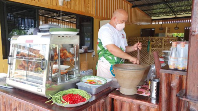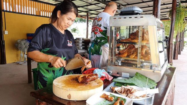 เลยคิดว่าภาระของตนแทนที่จะไปโฆษณาบอกเขาว่า ปลาร้าของเรามันดีอย่างโน้นดีอย่างนี้เราจะเอาอะไรไปยืนยัน ก็เลยเกิดสิ่งที่ตาใมาคือ เปิดร้านไก่ย่าง ส้มตำใส่น้ำปลาร้าผสมใบกัญชาตราโกต๋อง เพื่อจะให้ผู้ที่ชอบทานอาหารประเภทข้าวเหนียว ส้มตำ ไก่ย่าง ยำนัวต่างๆ ได้สัมผัสรสชาตและบอกต่อ โดยร้านของเราได้นำเอาน้ำปลาร้าสูตรผสมใบกัญชามาใช้ในการปรุงรส รวมทั้งนำใบกัญชาสดมาหมักไก่ที่เขาเรียกว่าไก่ย่างเขาสวนกวาง แล้วย่างขายเป็นการทำให้คนเข้าใจได้ว่าผลิตภัณฑ์ที่มีส่วนผสมของใบกัญชา สามารถนำมาปรุงอาหารได้หลายอย่างโดยเฉพาะอาหารประเภทส้มตำ ยำนัวต่างๆเป็นต้น จึงได้เกิดไก่ย่างโกต๋องขึ้นมาเพื่อจะให้การแอด Local ของเราอยู่กับพื้นที่ ให้มีความยั่งยืนเพื่อผลักดันตัวแบรนด์น้ำปลาร้าสูตรของเราให้เป็นที่รู้จักทั่วกัน
