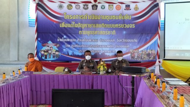 ที่ ศาลาวัดเจริญวารี บ้านโนนพะยอม ตำบลโนนพะยอม อำเภอชนบท จังหวัดขอนแก่น พล.ต.ต.ธรรมศักดิ์ ปิ่นทอง รอง ผบช.ภ.4 เป็นประธานตรวจเยี่ยมโครงการดำเนินงานชุมชนยั่งยืน เพื่อแก้ไขปัญหายาเสพติด เพื่อแก้ไขปัญหายาเสพติด ตามยุทธศาสตร์ชาติแบบครบวงจรตามยุทธศาสตร์ชาติ พร้อมด้วย พ.ต.อ.ไพโรจน์ ไทยพุทธา รอง ผบก.ภ.จว.ขอนแก่น ซึ่งลงพื้นที่ให้กำลังใจ พ.ต.อ.ชาญศิลป์ นาสูงชน ผกก.สภ.ชนบท และคณะ รวมถึงเจ้าหน้าที่ฝ่ายปกครอง หัวหน้าส่วนราชการ นายกองค์การบริหารส่วนตำบลโนนพะยอม และชาวบ้านโนนพะยอม ภาคีเครือข่ายต่าง ๆ ที่ร่วมมือกันดำเนินการในโครงการดังกล่าว