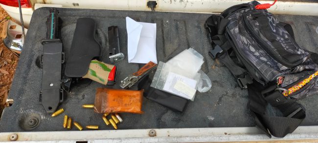 รอง สว.สอบสวน สภ.โสกก่าม ที่ออกตรวจพื้นที่อยู่บริเวณนั้น เพื่อขอทำการตรวจค้น จนท.ได้ตรวจค้นพบ อาวุธปืนสั้นยี่ห้อบาเร็ตต้า ขนาด 9 ม.ม. สีดำ แม็กกาซีนปืนบาเร็ตต้า บรรจุลูกกระสุนขนาด 9 ม.ม. จำนวน 3 นัด กระสุนปืนขนาด 9 ม.ม. จำนวน 8 นัด) ซุกซ่อนอยู่ในกระเป๋าสะพายข้างแบบลายพราง ซึ่งผู้ต้องหาสะพายอยู่ในขณะตรวจค้น อาวุธมีดพกสั้น ยาวประมาณ 1 ฟุต จำนวน 1 เล่ม ซึ่งแขวนไว้ที่เอวของผู้ต้องหาและ)อาวุธมีดพับ จำนวน 1 เล่ม สอบถามแล้วผู้ต้องหายอมรับว่าอาวุธปืน , เครื่องกระสุนปืน และอาวุธมีด ดังกล่าวเป็นของตนจริง เจ้าหน้าที่ตำรวจชุดจับกุมจึงได้จับกุมพร้อมแจ้งสิทธิ์ และข้อกล่าวหา“มีอาวุธปืนและเครื่องกระสุนปืน ไว้ในครอบครอง โดยไม่ได้รับอนุญาต” ให้ผู้ต้องหาทราบโดยละเอียดแล้ว และผู้ต้องหาก็รับทราบและเข้าใจเป็นอย่างดี จึงควบคุมตัวผู้ต้องหาและของกลางนำส่งพนักงานสอบสวน สภ.โสกก่าม เพื่อดำเนินคดีตามกฎหมายต่อไป