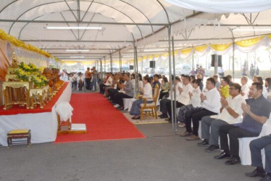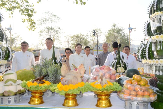 พิธีบวงสรวงศาลเทพารักษ์ เริ่มตั้งแต่เวลา 07.30 น. ประกอบพิธีทางพระพุทธศาสนา ถวายปัจจัยพร้อมเครื่องไทยธรรม พระสงฆ์กล่าวสัมโมทนียกถา และประกอบพิธีบวงสรวงเทวดา หลังจากนั้นนางรำสวมชุดผ้าไทยสีขาว ร่วมรำบวงสรวงและถวายพวงมาลัยองค์เทพารักษ์