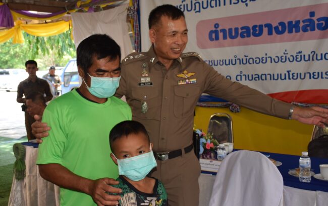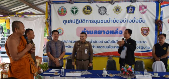 พล.ต.ท. บุญจันทร์ นวลสาย ข้าราชการบำนาญ วิทยากรต้นแบบ สำนักงานตำรวจแห่งชาติ ลงพื้นที่ ตรวจเยี่ยมศูนย์ปฏิบัติการชุมชนบำบัดอย่างยั่งยืน ตำบลยางหล่อ อำเภอศรีบุญเรือง ตามโครงการชุมชนบำบัดอย่างยั่งยืน ในตำบลแพร่ระบาดยาเสพติดสูงสุด 100 ตำบลตามนโยบายเร่งด่วนของรัฐบาล ชื่นชมผู้เสพที่ก้มกราบเท้าแม่ขอเลิกยุ่งเกี่ยวกับยาเสพติด ย้ำคนในครอบครัว ชุมชนต้องดูแลร่วมกันจึงจะเกิดความยั่งยืน