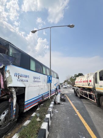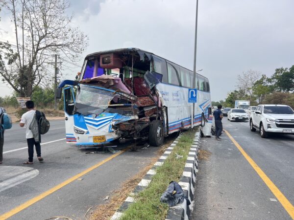 ตรวจสอบที่เกิดเหตุพบรถทัวร์โดยสารปรับอากาศ หมายเลขข้างรถ 22-23 ม.2 หมายเลขทะเบียน 10-9436 นครราชสีมา ด้านหน้าซ้ายกระจกแตก ชนท้ายกับรถพ่วง 18 ล้อ ทะเบียน 70-4085 เลย ที่บรรทุกวัสดุรีไซเคิลคลุมด้วยผ้าไปมาเต็มตันรถ ด้ายท้ายฝั่งขวาได้รับความเสียหายเล็กน้อย จอดไหล่ทางมุ่งหน้าขาล่องกรุงเทพมหานคร สอบถามนายจักรวาลย์ สุขพิพัฒน์ อายุ 34 ปี พนักงานขับรถทัวร์ปรับอากาศ แจ้งว่า เกิดอาการหลับหลับใน ทำให้ไม่สามารถเบรกรถทัน ขณะที่กำลังขับรถตามหลังรถบรรทุก 18 ล้อ จึงเกิดอุบัติเหตุขึ้น
