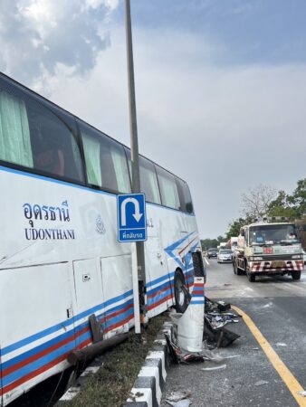วันที่18 เมษายน 2567 เวลา 15.00 น. นายสำเริง โสบุญมา ปลัดป้องกันอำเภอน้ำพอง จ.ขอนแก่นได้รับแจ้งว่าเกิดอุบัติเหตุรถโดยสารปรับอากาศ สายกรุงเทพฯ – อุดรธานี ชนท้ายรถบรรทุกพ่วง 18 ล้อ ที่บริเวณทางหลวงหมายเลข 2 (ยูเทิร์น) ใกล้วัดคำหัวช้าง บ้านมิตรภาพ ม.10 ต.ม่วงหวาน อ.น้ำพอง จ.ขอนแก่น ทำให้มีผู้ได้รับบาดเจ็บ จำนวน 12 ราย ถูกนำส่งโรงพยาบาลน้ำพอง จึงได้รายงานให้ผู้บังคับบัญชาทราบพร้อมกับแจ้งให้ ร.ต.อ.ยงยุทธ สุพรมพิทักษ์ ร้อยเวรสอบสวน สภ.น้ำพอง ออกตรวจที่เกิดเหตุ