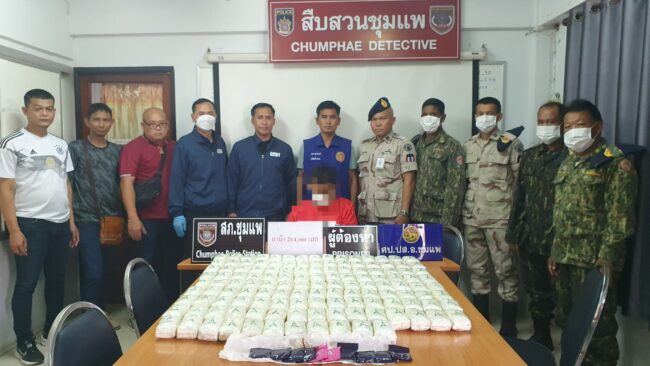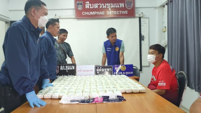 เมื่อเวลา 08.00 น. วันที่ 21 เม.ย.67 นางสาวอ้อยใจ คำบุญเรือง นายอำเภอชุมแพ ผู้อำนวยการศูนย์ปฏิบัติการป้องกันและปราบปรามยาเสพติดอำเภอชุมแพ (ศป.ปส.อ.ชุมแพ) จังหวัดขอนแก่น มอบหมายให้ นายนคร สุพรรณ์ ปลัดอาวุโสอำเภอชุมแพ ร่วมกับ พ.ต.อ.รักชาติ เรืองเจริญ ผกก.สภ.ชุมแพ พ.ต.ท.ลักษณ์ ด้วงลำพันธ์ รอง ผกก.สส.สภ.ชุมแพ พ.ต.ท.ศิวัช โพธิ์สิงห์ สว.สส.สภ.ชุมแพ ร.ต.อ.อดิพงษ์ พินไธสง รอง สว.สส. ร.ต.อ.ศรัณย์ แสนหล้า รอง สว.สส. พร้อมเจ้าหน้าที่ตำรวจชุดสืบสวน เจ้าหน้าที่ฝ่ายปกครอง สมาชิก อส.ที่ 6 อ.ชุมแพ ร่วมกันแถลงข่าวจับกุมตัวนายแฟลช (นามสมมุติ) อายุ 27 ปี ชาวตำบลชุมแพ อ.ชุมแพ จ.ขอนแก่น พร้อมด้วยของกลางยาบ้าจำนวน 264,000 เม็ด บรรจุห่อ 132 มัด พร้อมตรวจยึดทรัพย์สินตาม ป.ยาเสพติด จำนวน 3 รายการ มูลค่าประมาณ1,240,000 บาท ประกอบด้วยรถยนต์โตโยต้า ฟอร์จูนเนอร์ จำนวน 1 คันทองรูปพรรณ จำนวน 1 เส้น น้ำหนัก 5 บาท โทรศัพท์มือถือยี่ห้อไอโฟน 15 จำนวน 1 เครื่อง โดยจับกุมได้ที่บ้านพัก พร้อมตรวจยึดยาบ้าบรรจุในถุงขยะสีดำ 3 ใบได้ภายในห้องเช่าไม่มีเลขที่ หมู่ 2 บ้านหัวหนอง ต.ชุมแพ อ.ชุมแพ จ.ขอนแก่น หลังชุดสืบสวน สืบทราบว่าผู้ต้องหามีพฤติกรรมเกี่ยวข้องกับยาเสพติด