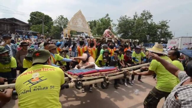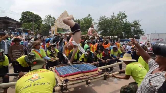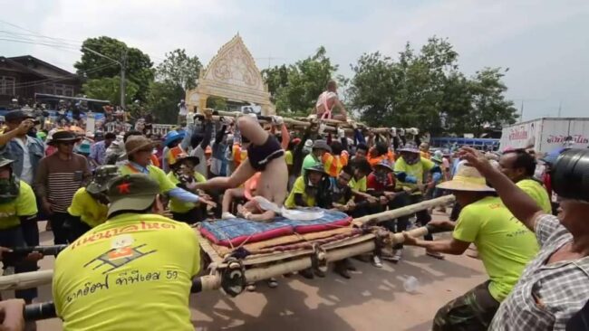 ที่จะมีความสนุกสนานตั้งแต่เมื่อขบวนแห่นาคโหดออกจากประตูวัดตาแขกเพื่อแห่ไปรอบหมู่บ้าน ได้เพียง 3 นาค ได้เกิดฝนตกลงมาอย่างหนัก แต่ก็ดูจะไม่เป็นอุปสรรคของขบวนแห่นาคโหดแต่ละนาคในปีนี้เลย ก็ยังมีการแห่ขบวนต่อไปทั้งแห่ทั้งโยก ทั้งโยนนาคท่ามกลางสายฝน และสนุกสนานกับการเต้นออกสเต็ปกันอย่างสนุกสนานหน้ารถแห่ กลางสายฝน เป็นที่ประทับใจกันทั้งคนหามคนแห่ และนักท่องเที่ยวที่มารอชมในปีนี้อย่างคึกคักกว่าทุกปีอีกด้วย