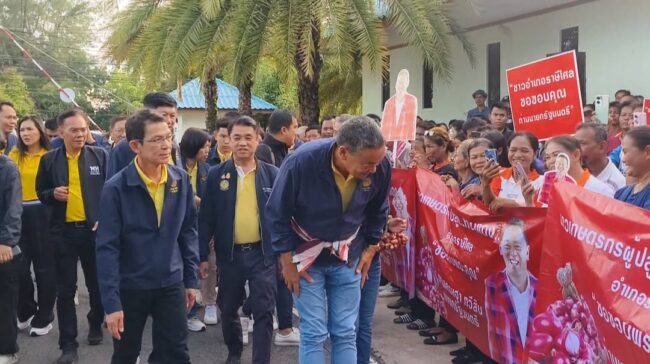 โดยในขณะที่ นายกรัฐมนตรี เดินทางมาถึงอาคารสำนักงานฯ ได้มีกลุ่มเกษตรกรผู้ปลูกหอมแดง อ.ยางชุมน้อย และ อ.ราษีไศล จ.ศรีสะเกษ ได้ตั้งแถวรอต้อนรับเพื่อแสดงความขอบคุณที่ นายกรัฐมนตรี ทำให้ราคาผลผลิตหอมแดงในปีนี้นั้น มีราคาสูงขึ้น จากเดิมเพียงกิโลกรัมละ 7-8 บาท เป็น 13-15 บาท ส่งผลทำให้เกษตรกรและชาวบ้านสามารถลืมตาอ้าปากได้ พร้อมนำเสนอขอให้ นายกรัฐมนตรี ช่วยผลักดันให้มีราคาที่สูงขึ้นอีก ถึงกิโลกรัมละ 20 บาท พร้อมมอบกระเช้าหอมแดง เป็นของฝากซึ่งเป็นของดีศรีสะเกษ ให้กับนายกรัฐมนตรี อีกด้วย