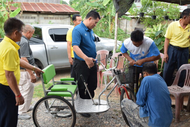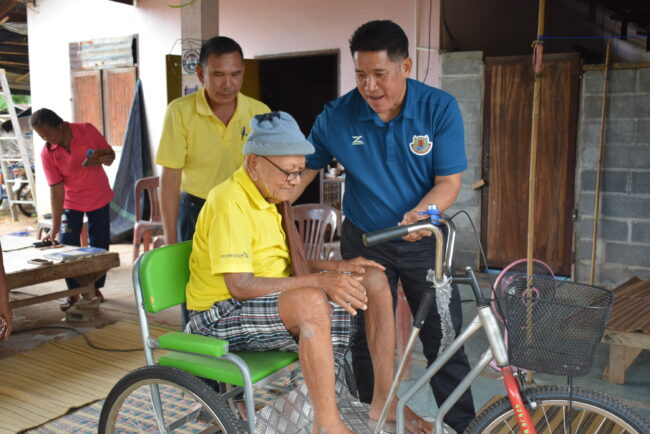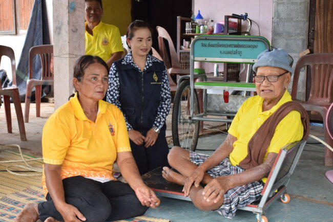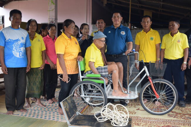 โดยนายหลายฯเล่าว่าเดิมไปไหนมาไหนได้ปกติ แต่เมื่อช่วงวิกฤตโควิตที่ผ่านมากำลังขาอ่อนแรงไม่สามารถลุกเดินได้ แต่สามารถกระดุกกระดิกขาทั้ง 2 ข้างต้องพึ่งพาลูกหลานคอยดูแลเมื่อจะไปเข้าห้องน้ำ อาบน้ำ แต่ถึงอย่างไรก็ตามนายหลายฯบอกว่าชีวิตจะต้องสู้ถึงแม้นร่างกายจะไม่สมบูรณ์ จากนี้ไปตนเองจะนำรถโยกและม้านั่งล้อเลื่อน เยี่ยมและให้กำลังใจนายหลายฯผู้ป่วยติดเตียงไปไหนมาไหนด้วยความยากลำบาก ในขณะที่เจ้าตัวทดลองนั่งรถโยกออกนอกบ้านและม้านั่งล้อเลื่อนด้วยความดีใจ หวังว่าตนเองจะมีคุณภาพชีวิตที่ดีขึ้น ในการใช้ชีวิตประจำวันที่สะดวกจากนี้ไปจะเดินทางไปพบปะผู้คนได้บ้างและขอบคุณนายอำเภอศรีบุญเรือง พร้อมคณะของท่านนายกเหล่ากาชาดจังหวัดจังหวัดหนองบัวลำภู