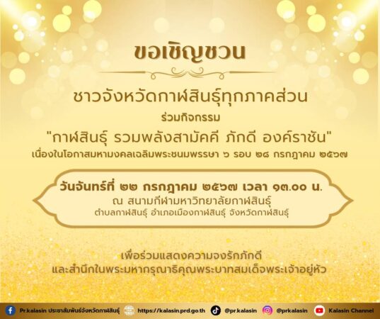 จังหวัดกาฬสินธุ์ โดยผู้ว่าราชการจังหวัดกาฬสินธุ์ มอบหมายให้สำนักงานพัฒนาชุมชนจังหวัดกาฬสินธุ์ เชิญชวนประชาชนชาวกาฬสินธุ์ทุกภาคส่วนร่วมกิจกรรม “กาฬสินธุ์ รวมพลังสามัคคี ภักดี องค์ราชัน” เฉลิมพระเกียรติพระบาทสมเด็จพระเจ้าอยู่หัว เนื่องในโอกาสมหามงคลเฉลิมพระชนมพรรษา 6 รอบ 28 กรกฎาคม 2567 ที่สนามกีฬามหาวิทยาลัยกาฬสินธุ์ วันจันทร์ที่ 22 กรกฎาคม 2567 นี้