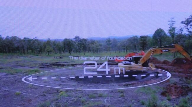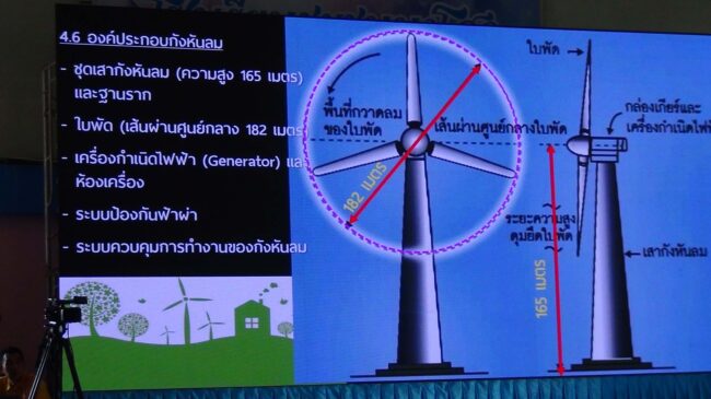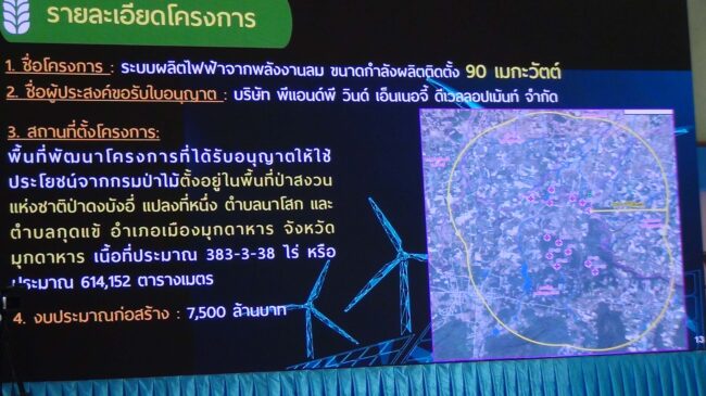 ทั้งนี้ โครงการระบบผลิตไฟฟ้าจากพลังงานลม ขนาดกำลังผลิตติดตั้ง 90 เมกะวัต บริษัท พีแอนด์พี วินด์ เอ็นเนอจี้ ดีเวลลอปเม้นท์ จำกัด พื้นที่ ได้รับอนุญาตฯ 383 – 3 – 38 ไร่ จำนวน 13 ต้น ความสูง 165 เมตร ใบพัด 182 เมตร บริเวณภูยูง ในพื้นที่ตำบลกุดแข้ และตำบลนาโสก อำเภอเมือง จังหวัดมุกดาหาร .