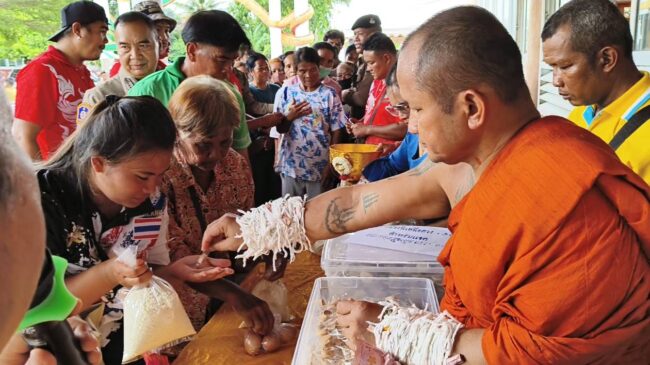 หลังพิธีทุกอย่างเสร็จสิ้น พระครูวินัยธร ศักดิ์มนตรี ปภัสโร หรือ “หลวงปู่โชติ ปภัสโร” เจ้าอาวาสวัดศรีสมบูรณ์รัตนาราม ได้นำศิษยานุศิษย์ผู้ใจบุญ แจกทานไข่ไก่ จำนวน 2 หมื่นฟอง ข้าวสาร 1,000 กิโลกรัม และวัตถุมงคล รุ่น มงคลเศรษฐี รวยทันใจ ล้านล้าน “หลวงปู่โชติ ปภัสโร” ที่เพิ่งผ่านพิธีพุทธาภิเษกปลุกเสกในงานดังกล่าว อีกจำนวน 1 หมื่นองค์ อีกด้วย โดยชาวบ้านที่มาร่วมงานได้มีการต่อแถวรอรับของแจกแบบยาวเหยียดจนท้ายแถวล้นออกไปนอกรั้วประตูวัด เรียกได้ว่า ได้ทั้งบุญ อิ่มทั้งท้อง และยังมีของฝากกลับบ้านอีกด้วย.