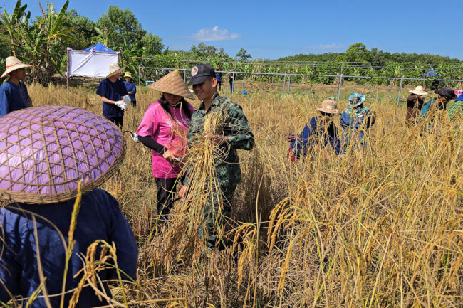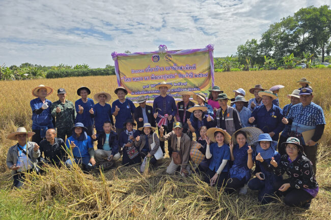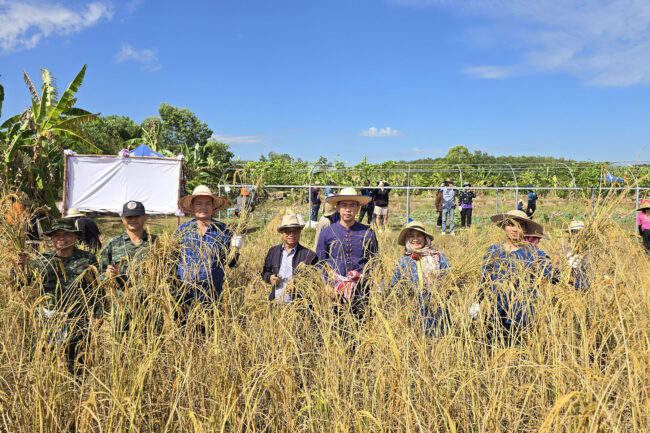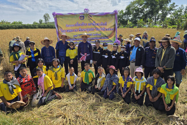 นายอำเภอรัตนวาปี เกี่ยวข้าวเอามือสามัคคี “โคก หนอง นา พัฒนาชุมชน” ประจำปี 2567