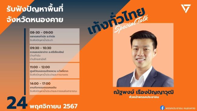ในวันที่ 24 พ.ย.67 นายณัฐพงษ์ เรืองปัญญาวุฒิ หัวหน้าพรรคประชาชน จะเดินทางมารับฟังปัญหาจากประชาชน พื้นที่ จ.หนองคาย จุดแรก ที่ บริเวณตลาดสด อ.ท่าบ่อ,บ้านไทยสามัคคี ต.หนองปลาปาก อ.ศรีเชียงใหม่,ศูนย์วัฒนธรรมไทยพวน อ.โพธิ์ตาก และบริเวณวัดหายโศก อ.เมืองหนองคาย ตามลำดับ