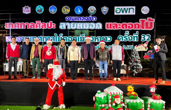 วันที่ 25 ธ.ค.67 ที่ลานรักนะภูเรือ สนามหน้าที่ว่าการอำเภอภูเรือ จังหวัดเลย นายชัยพจน์ จรูญพงศ์ ผู้ว่าราชการจังหวัดเลย ประธานเปิดการแถลงข่าวงานเทศกาลศิลปะสายหมอก และดอกไม้ ของกลุ่มจังหวัดภาคตะวันออกเฉียงเหนือตอนบน 1 และงานเทศกาลไม้ดอกเมืองหนาว ครั้งที่ 32 มีนายนายประยูร อรัญรุท รองผู้ว่าราชการจังหวัดเลย นายณัฐพล เหลืองวงศ์ไพศาล ประธานหอการค้ากลุ่มจังหวัดภาคตะวันออกเฉียงเหนือตอนบน 1 (5 จังหวัดอีสานตอนบน) จริยาทร สู่หู ผอ.ททท.เลย นายธรรมนูญ ภาคธูป ผู้จัดการสำนักงานพื้นที่พิเศษ 5 หัวหน้าส่วนราชการ ผู้นำองค์กรปกครองส่วนท้องถิ่นและแขกผู้มีเกียรติ