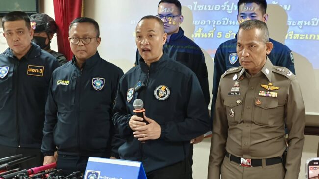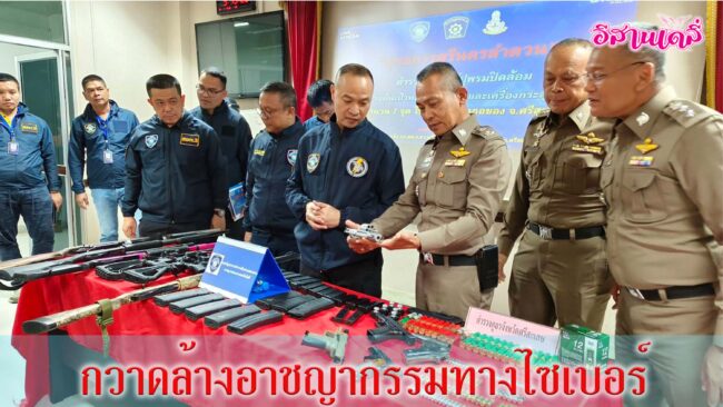 เมื่อวันที่ 24 มกราคม 2568 ที่ห้องประชุมชั้น 2 กองบังคับการตำรวจภูธรจังหวัดศรีสะเกษ (ภ.จว.ศรีสะเกษ) พล.ต.ท.ไตรรงค์ ผิวพรรณ ผบช.สอท. ร่วมกับ พล.ต.ต.พิษณุ วัตถุ ผบก.ภ.จว.ศรีสะเกษ ร่วมกันแถลงผลการจับกุมปฏิบัติการ “ยุทธการนครศรีลำดวน” ตำรวจไซเบอร์ ปูพรมปิดล้อมตรวจค้นเป้าหมายอาวุธปืนและเครื่องกระสุนปืนจำนวน 7 จุด ในพื้นที่ 5 อำเภอ ของ จ.ศรีสะเกษ เพื่อเป็นการปราบปรามอาชญากรรมทางเทคโนโลยี โดยเฉพาะการลักลอบซื้อขายอาวุธปืนทางออนไล การครอบครองอาวุธปืนและเครื่องกระสุนปืนโดยผิดกฎหมายในพื้นที่จังหวัดศรีสะเกษ