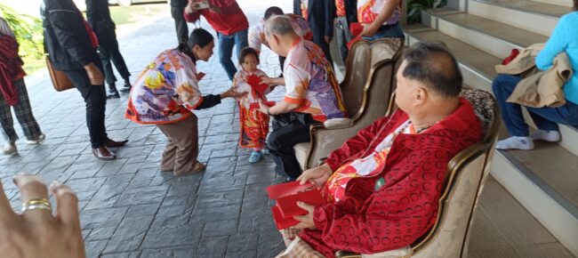 กระทั่งเวลา 09.30 น. เสี่ยปรีชา ชัยรัตน์ อายุ 75 ปี และ เสี่ยประชา ชัยรัตน์ อายุ 67 ปี น้องชาย พร้อมด้วยญาติพี่น้อง ลูกหลาน เดินทางกลับจากไหว้บรรพบุรุษ เข้ามาที่บ้านสำลีเงิน จากนั้นเสี่ยปรีชาได้นั่งเก้าอี้แจกอั่งเปาประชาชน กลุ่มแรกเป็นคนพิการ คนชรา ผู้หญิงและเด็ก ซึ่งเดินเข้ามารับอั่งเปาอย่างเป็นระเบียบ เรียบร้อย ประชาชนบางคนได้รับอั่งเปา ก็ได้อวยพรให้เสี่ยปรีชาสุขภาพแข็งแรง อายุยืนยาว ซึ่งทุกคนถือซองสีแดงเดินออกจากประตูไปด้วยสีหน้ายิ้มแย้ม