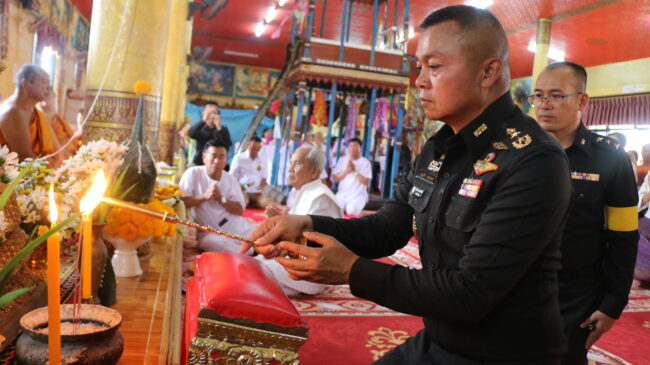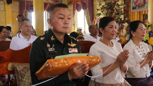 วันที่ 5 เมษายน 2568 ที่ วัดสุกกิจเจริญ ตำบลเมืองหมี อำเภอเมืองหนองคาย พลโทบุญสิน พาดกลาง แม่ทัพภาคที่ 2 และคณะ ได้เดินทางมาทำบุญถวายพระพุทธรูปปรางนาคปรกและต้นผ้าป่า โดยมี ผู้นำท้องถิ่น และประชาชนในพื้นที่ให้การต้อนรับ โดย พลโทบุญสิน พาดกลาง มทภ. 2 และคณะได้ทำพิธีเปิดผ้าคลุมพระพุทธรูป อัญเชิญขึ้นเสลี่ยง และ เป็นประธานเดินนำขบวนแห่พระพุทธรูปและต้นผ้าป่า ไปยังโบสถ์วัดสุกกิจเจริญ ระยะทางประมาณ 100 เมตร เวียนรอบโบสถ์ 3 รอบ และขึ้นกราบพระประธานในโบสถ์ ต่อจากนั้น ได้อัญเชิญพระพุทธรูปปรางนาคปรกขึ้นบนศาลาเพื่อประกอบพิธีถวายพระและต้นผ้าป่า ก่อนร่วมกับคณะถวายจตุปัจจัยไทยธรรม แด่พระพิกษุสงฆ์