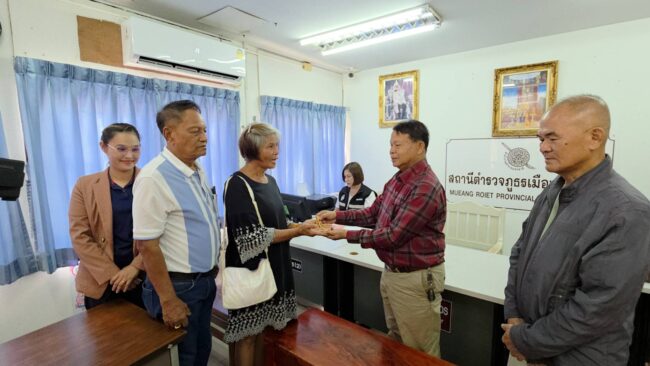 เรื่องราวน่าประทับใจเกิดขึ้นที่ สภ.เมืองร้อยเอ็ด เมื่อวันที่ 7 พฤษภาคม 2568 เวลา 15.00 น.เมื่อนางประยงค์ ผุดบัวดง อายุ 61 ปี อดีตข้าราชการครู เดินทางมาขอรับสร้อยคอทองคำและเลสข้อมือ น้ำหนักรวม 4 บาท มูลค่าราว 200,000 บาท ซึ่งทำหล่นหายไว้โดยไม่รู้ตัว ก่อนจะมีพลเมืองดี 3 คน เก็บได้และรีบแจ้งเจ้าหน้าที่ตำรวจ เพื่อตามหาเจ้าของอย่างเร่งด่วน