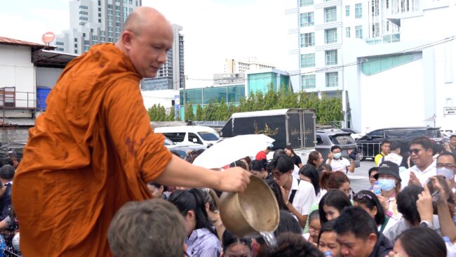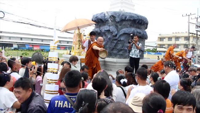 จากนั้น หลวงพ่ออุดล อคฺคธมฺโม เจ้าอาวาสวัดป่าดงเมือง อ.ร่องคำ จ.กาฬสินธุ์ พร้อมด้วย พระสงฆ์ รวม 4 รูป ได้เมตตาตักน้ำมนต์ในถัง จำนวน 9 ถัง ที่ผ่านการปลุกเสกแล้ว สาดพรมให้กับประชาชนที่เดินทางมาร่วมงาน โดยได้ต่อแถวกันเข้าอาบน้ำมนต์ เพื่อความเป็นสิริมงคล บางคนได้นำขันที่โรงแรมเตรียมไว้ให้ตักอาบเอง บางคนนำเอาขวดน้ำพลาสติกมากรอกเอาน้ำมนต์ในถังกลับไปไว้บูชาที่บ้าน และนำไปฝากญาติพี่น้องที่ไม่ได้เดินทางมาร่วมงานอีกด้วย