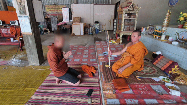 ที่กุฎิเจ้าอาวาส เป็นกุฎิปูนชั้นเดียว พบพระสุทัศน์ สุธัมโม อายุ 48 ปี แสดงตัวเป็นเจ้าอาวาส และพระหงส์ อายุ 42 ปี ซึ่งเป็นพระลูกวัด 1 รูป เจ้าหน้าที่ได้แสดงตัว ตำรวจแจ้งว่าได้รับการร้องเรียนจากชาวบ้านว่า พระในวัดนี้เกี่ยวข้องกับยาเสพติด จึงมาขอตรวจปัสสาวะพระในวัด ซึ่งเจ้าอาวาสแจ้งว่าภายในวัดมีพระ 2 รูป เจ้าหน้าที่จึงตรวจปัสสาวะ พบว่าปัสสาวะพระสุทัศน์ เจ้าอาวาสวัด เป็นสีม่วง พบสารเสพติด ส่วนพระหงส์พระลูกวัดไม่พบสารเสพติด