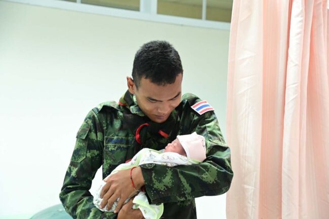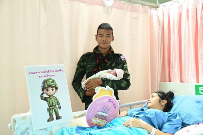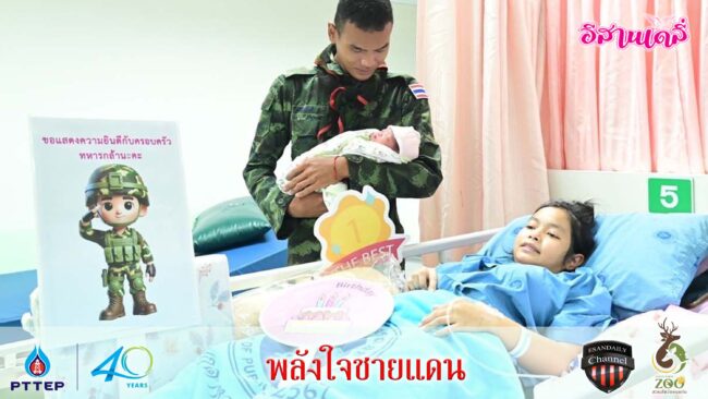 เมื่อวันที่ 6 กันยายน 2568 ที่หอผู้ป่วยหลังคลอด ชั้น 4 อาคารมโนรมย์ โรงพยาบาลมุกดาหาร แพทย์หญิงกันตินันท์ มหาสุวีระชัย ผู้อำนวยการโรงพยาบาลมุกดาหาร เยี่ยมและให้กำลังใจภรรยาและบุตรของนายทหารกองประจำการ ซึ่งมาคลอดบุตรและพักรักษาตัว นายทหารกองประจำการรายดังกล่าว ปฏิบัติหน้าที่ราชการสนามในตำแหน่ง พลปืนเล็ก สังกัดกองร้อยทหารราบที่ 131 กองพันทหารราบที่ 13 ปฏิบัติภารกิจป้องกันประเทศชายแดนไทย–กัมพูชา ในพื้นที่บ้านโดนอาว์ ตำบลโดนอาว์ อำเภอกันทรลักษ์ จังหวัดศรีสะเกษ