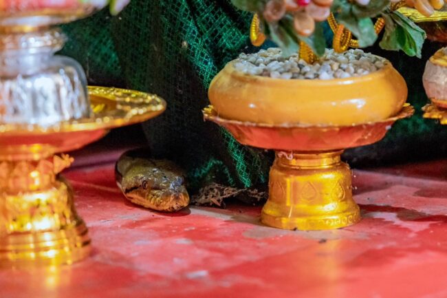 วันที่ 18 ก.ย.68 เวลา 07.30 น.ที่ บริเวณศาลปู่ศรีสุทโธและย่าประทุมมา ในเกาะคำชะโนด บ้านโนนเมือง ต.บ้านม่วง อ.บ้านดุง จ.อุดรธานี นายพิสิษฐ์ชัย อภัยปิยกุล รอง ผวจ.อุดรธานี และนายสุริยนต์ ดอนสมจิตร นายอำเภอบ้านดุง พร้อมด้วยกรรมการคำชะโนด ได้ทำพิธีขอขมาบอกกล่าวปู่ศรีสุทโธและย่าประทุมมา เพื่อเตรียมจัดงานคำชะโนดโลกครั้งที่ 1 ที่จะมีขึ้นในช่วงออกพรรษา วันที่ 8-12 ต.ค.68 ที่จะถึงนี้ แต่ขณะทำพิธีอยู่ ก็ปรากฏว่า มีงูใหญ่โผล่หัวออกมาตรงศาลปู่ย่าคำชะโนด และเมื่อส่องดูถึงกับขนลุกมีพญางูเหลือมใหญ่ยาว 1 เมตร รวม 2 ตัว ขดอยู่ใต้ฐานปู่ศรีสุทโธ ทำให้คนที่ไปร่วมพิธี ต่างพากันขนลุกและอัศจรรย์ในบารมีอย่างยิ่ง โดยทุกคนเชื่อกันว่า ปู่ย่าคำชะโนดท่านเปิดทาง ให้จัดงานใหญ่ครั้งนี้เป็นไปอย่างราบรื่นไม่มีอุปสรรคใด ๆ ถือเป็นนิมิตหมายที่ดี