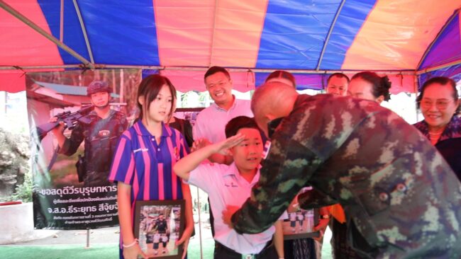 จากนั้นบิ๊กกุ้งได้เดินไปให้กำลังใจครอบครัว จ.ส.อ. (พ) ธีระยุทธ สีจุ้ยจ้าย หรือจ่าจุ้ย อายุ 39 ปี สังกัด ร.13 พัน 3 ค่ายเจ้าพระยาสุรวงศ์วัฒนศักดิ์ อ.เมือง จ.อุดรธานี ที่ได้พลีชีพเพื่อปกป้องแผ่นดินไทย จากเหตุปะทะที่ บริเวณฐานปฏิบัติการช่องสายตะกู อ.บ้านกรวด จ.บุรีรัมย์ โดยมอบเงินขวัญกำลังใจให้กับนางมยุริน สีจุ้ยจ้าย อายุ 40 ปี ด.ญ.จุฑามาศ สีจุ้ยจ้าย “น้องปิ่นมุก” อายุ 13 ปี และ ด.ช.จิรภัทร สีจุ้ยจ้าย “น้องภูผา” อายุ 7 ขวบ ภรรยาและลูก ซึ่งบิ๊กกุ้งได้ตรงเข้าไปกอดน้องภูผาอย่างเป็นกันเอง พูดคุยให้กำลังและถามย้ำถึงความตั้งใจที่อยากเป็นทหารในอนาคต น้องภูผาได้ทำท่าตะเบ๊ะ วันทยหัตถ์แสดงความเคารพแบบทหาร และบิ๊กกุ้งได้เซนต์ชื่อบนกรอบรูปให้แก่น้องภูผา ก่อนจะยิ้มเขินและบอกว่า “ผมเป็นแฟนคลับลุงกุ้งครับ”