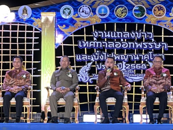 วันที่ 18 กันยายน 2568 เวลา 18.30 น. ที่ บริเวณลานวัฒนธรรมหน้าวัดลำดวน (ลานพญานาคคู่) ริมฝั่งแม่น้ำโขง เทศบาลเมืองหนองคาย นายจำลักษ์ กันเพ็ชร์ รองผู้ว่าราชการจังหวัดหนองคาย,นายประทีป อุ่ยเจริญ ปลัดจังหวัดหนองคาย ,นายแพทย์สุรพงษ์ ผดุงเวียง นายแพทย์สาธารณสุขจังหวัดหนองคาย ,พ.ต.อ.จิรวิทย์ ปานยิ้ม ผู้กำกับการตำรวจภูธรเมืองหนองคาย,นางสาวกนกวรรณ ดุงศรีแก้ว ผู้อำนวยการการท่องเที่ยวแห่งประเทศไทย (ททท.)สำนักงานอุดรธานี ,นายอรรถพร ภักดีสุจริต นายกเทศมนตรีเมืองหนองคายและนายพิเชษฐ์ ตันเทิดทิตย์ รองนายกองค์การบริหารส่วนจังหวัดหนองคาย ได้ร่วมกันแถลงข่าว พร้อมรับนักท่องเที่ยวเทศกาลออกพรรษาชมความมหัศจรรย์บั้งไฟพญานาคโลกประจำปี 2568