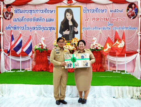 วันที่ 9 ตุลาคม 2568 ที่โดมอเนกประสงค์ ศูนย์การศึกษาพิเศษ ประจำจังหวัดเลย นายชัยพจน์ จรูญพงศ์ ผู้ว่าราชการจังหวัดเลย เป็นประธานมอบทุนการศึกษามูลนิธิคุณพุ่ม สำหรับเด็กออทิสติกและเด็กพิการในมูลนิธิคุณพุ่ม ประจำปี 2568 พร้อมมอบเกียรติบัตรให้ผู้ทำคุณูปการให้กับคนพิการจังหวัดเลย และเยี่ยมชมนิทรรศการผลงานเด็กพิเศษและครู ที่เป็นผลงานโดดเด่น เลี้ยงอาหารกลางวันแก่เด็กพิเศษและผู้ปกครอง โดยมี นางสาวชนัญภรณ์ จันทะวัน ผู้อำนวยการศูนย์การศึกษาพิเศษ ประจำจังหวัดเลย เหล่ากาชาดจังหวัดเลย หัวหน้าส่วนราชการ ผู้บริหาร คณะครู บุคลากรทางการศึกษา นักเรียน และผู้ปกครอง เข้าร่วมพิธี