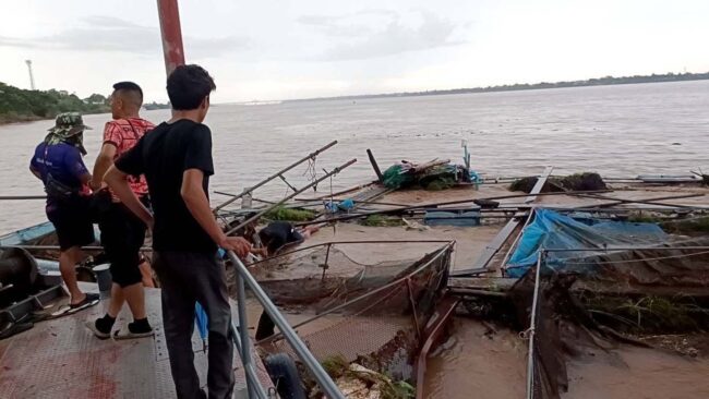 กระชังปลาลอยมาตามน้ำโขง จำนวน 60 หลุม ไหลมาชนแพตำรวจน้ำมุกดาหาร เจ้าหน้าที่เร่งรื้อถอดลดแรงต้านป้องกันแพจม
