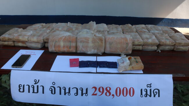 กระทั่งเวลาประมาณ 01.30 น. ของวันที่ 27 ต.ค.68 เจ้าหน้าที่พบเรือกีบเพลายาว 1 ลำ มีชาย 2 คน ขับเรือมาจากฝั่งประเทศเพื่อนบ้านมุ่งหน้ามาฝั่งประเทศไทย พอถึงบริเวณกลางแม่น้ำโขง ได้ดับเครื่องจากนั้นชายทั้ง 2 ได้พายเรือเข้ามาฝั่งไทย และเข้าจอดบริเวณริมฝั่งเขื่อนป้องกันตลิ่งบ้านแดนเมือง จากนั้นพบชายต้องสงสัย 2 คน เดินออกมาจากพงหญ้าบริเวณข้างเขื่อนป้องกันตลิ่ง แล้วเดินตรงไปยังบริเวณบันไดทางลงเขื่อนฯ จากนั้นได้แบกวัตถุต้องสงสัยขึ้นมาบนเขื่อนฯ จนท.จึงได้แสดงตัวขอตรวจค้น เมื่อทั้ง 2 คนเห็นเป็นเจ้าหน้าที่ได้ทิ้งกระสอบแล้วกระโดดน้ำส่วนชายที่ขับเรือได้ติดเครื่องเรือขับหลบหนีมุ่งหน้าไปยังประเทศเพื่อบ้านอย่างรวดเร็ว ก่อนเจ้าหน้าที่ฯ เข้าตรวจสอบพื้นที่ พบกระสอบปุ๋ยสีขาว 1 กระสอบ จึงได้เปิดดูเบื้องต้นพบด้านในบรรจุยาบ้า จึงได้นำยาบ้าไปตรวจสอบอย่างละเอียดที่ หน่วยเรือโพนพิสัย รวมยาบ้าที่ตรวจยึดได้ครั้งนี้ จำนวน 298,000 เม็ด จากนั้นจึงได้นำของกลางทั้งหมด ส่งพนักงานสอบสวน สภ.โพนพิสัย ดำเนินคดีตามกฎหมายต่อไป