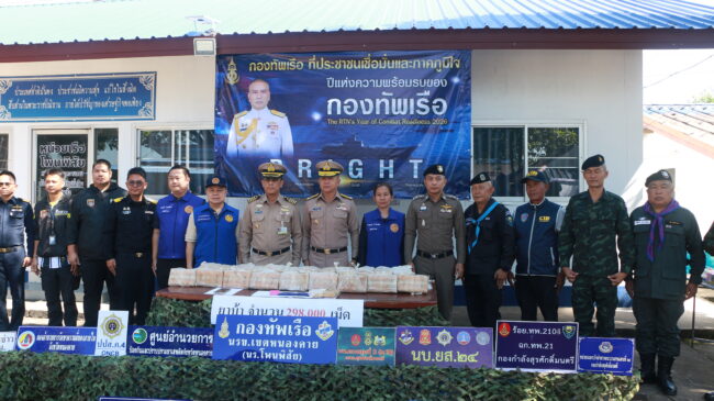 วันที่ 28 ตุลาคม 2568 ที่ หน่วยเรือโพนพิสัย หน่วยเรือรักษาความสงบเรียบร้อยตามลำแม่น้ำโขง เขตหนองคาย พล.ร.ต.ณรงค์ เอมดี ผบ.นรข.,นาวาเอก วิศิษฐ์พงศ์ เจริญวิชยเดช ผู้บังคับหน่วยเรือรักษาความสงบเรียบร้อยตามลำแม่น้ำโขง เขตหนองคาย ,ร.อ.ภาสพล สีทองเกตุ หน.หน่วนเรือโพนพิสัย,นายเดชมนตรี ผิวเหลือง ป้องกันจังหวัดหนองคาย,พ.ต.อ.สุรกิจ ค้วนเครือ ผกก.สภ.โพนพิสัย,ฝ่ายปกครองอำเภอโพนพิสัย ,ร้อย ฉก.ทพ 2105 ,ร.ต.ไชโย หรพูน บกควบคุมที่ 2 กกล.สุรศักดิ์มนตรี และหน่วยงานที่เกี่ยวข้อง ร่วมกันแถลงผลการตรวจยึดยาบ้า จำนวน 298,000 เม็ด ได้ที่บริเวณเขื่อนป้องกันตลิ่งริมฝั่งแม่น้ำโขง หน้าสถานีโรงไฟฟ้าย่อย บ.แดนเมือง ต.วัดหลวง อ.โพนพิสัย จว.หนองคาย