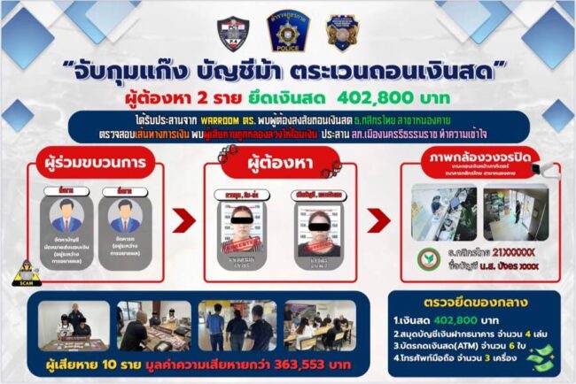 ส่วน พ.ต.ท. วัชราทิตย์ เกิดทิพย์ สว.กก.การวิเคราะห์ข่าวกองบังคับการสืบสวน ภ.4 เปิดเผยว่า ตำรวจสืบสวน สภ.เมืองหนองคาย ได้รับการประสานจาก ศปอส.ภ.4 มีบัญชีม้าตระเวนถอนเงินสด ในเขตพื้นที่ จ.หนองคาย ทางตำรวจสืบสวน ได้ติดตามและจับกุมผู้ต้องหาเป็นหญิงได้ 2 ราย พร้อมยึดของกลาง เงินสด 402800 บาท สมุดบัญชีธนาคาร 4 เล่ม บัตร ATM 6 ใบ มือถือ 3 เครื่อง จากการสอบสวน ผู้ต้องหาได้มีการซัดทอดชายและหญิง 2 รายอยู่ระหว่างการสอบสวนขยายผล ซึ่งผู้ต้องหาได้รับจ้างถอนเงิน 1,000 บาท ต่อเงิน 1 แสนบาท พบผู้เสียหายทั้งหมด 10 ราย มูลค่าความเสียหาย 363,553 บาท และสามารถดำเนินการคืนเงินให้ผู้เสียหายได้ 3 ราย โดยรายแรก 11,206 บาท รายที่สอง 20,000 บาท และรายที่สาม 49,000 บาท รวมเป็นเงินทั้งสิ้น 80,206 บาท