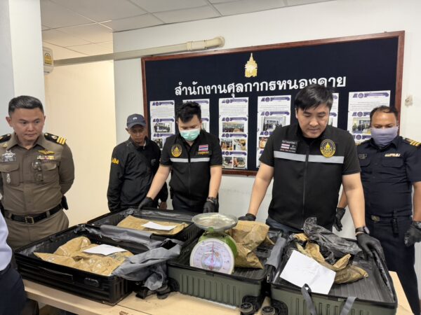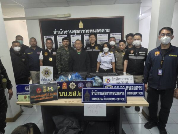 วันที่ 3 พฤศจิกายน 2568 เวลา 15.30 น. ที่ด่านพรมแดนสะพานมิตรภาพไทย-ลาว แห่ง ที่ 1 จังหวัดหนองคาย นายประทีป อุ่ยเจริญ ปลัดจังหวัดหนองคาย, พล.ต.ต.อัทธชนม์ ช่วงงาม ผบก.ภ.จว.หนองคาย,นางสาววรรณา ผู้อุตส่าห์ นายด่านศุลกากรหนองคาย,พ.ต.อ.จิรวิทย์ ปานยิ้ม ผกก.สภ.เมืองหนองคาย,พ.อ.อุดมการณ์ ศรีแขไตร รอง ผบ.บก.ควบคุมที่ 2 (ร.13), นายพัฒนพงศ์ ตันติวัฒนกุลชัย หน.ฝ่ายบริการศุลกากรที่ 1, นายอเนขา พายุหิน หน.ฝ่ายสืบสวนและปราบปราม ศุลกากรหนองคาย ,ตม.หนองคาย,นบ.ยส.24 กกล.สุรศักดิ์มนตรี ,ตฃด.245,สน.เรือหนองคาย ร่วมกับหน่วยงานความมั่นคงในพื้นที่ แถลงผลการจับกุม น.ส.เรืองรอง รัตน์นุ่มน้อย อายุ 39 ปี ชาว ต.บ่อพลอย อ.บ่อไร่ จ.ตราด ,นายณรงค์ชัย วรรณาพรม อายุ 61 ปี (คนขับรถ), MISS DAOLIN SOUKHAMONTY (สัญชาติลาว) อายุ 25 ปี เมื่อวันที่ 2 พ.ย.68 เวลา 17.00 น.พร้อมของกลางเฮโรอีน 10.8 กก. ซุกในกระเป๋าเดินทาง จากนั้นเวลา 17.30 น เจ้าหน้าที่ได้จับกุม น.ส.อารียา พงษ์สัมฤทธิ์ อายุ 31 ปี ชาว ต.บางพูด อ.ปากเกร็ด จ.นนทบุรีและนายสุเมธ มงคลสวัสดิ์ อายุ 59 ปี (คนขับรถ) พร้อมของกลางเฮโรอีน 11 กก. ที่ซุกซ่อนในกระเป๋าเดินทาง