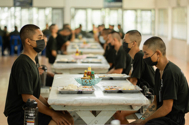 พันโท ณรงค์พล ลี้ไพบูลย์ ผู้บังคับกองพันทหารราบที่ 3 กรมทหารราบที่ 8 ร่วมรับประทานอาหารเที่ยงกับทหารใหม่ เพื่อสร้างขวัญกำลังใจและดูแลความเป็นอยู่ ณ โรงเลี้ยง กองพันทหารราบที่ 3 กรมทหารราบที่ 8 ค่ายสีหราชเโชไชย ตำบลศิลา อำเภอเมือง จังหวัดขอนแก่น โดยจะพูดคุยสอบถามถึงปัญหาต่างๆ และให้กำลังใจในการฝึก เพื่อสร้างความรู้สึกอบอุ่นและเป็นกันเอง เปรียบเสมือนคนในครอบครัวเดียวกัน และเป็นการกำกับดูแลด้านคุณภาพชีวิตของกำลังพลให้เป็นไปตามนโยบาย
