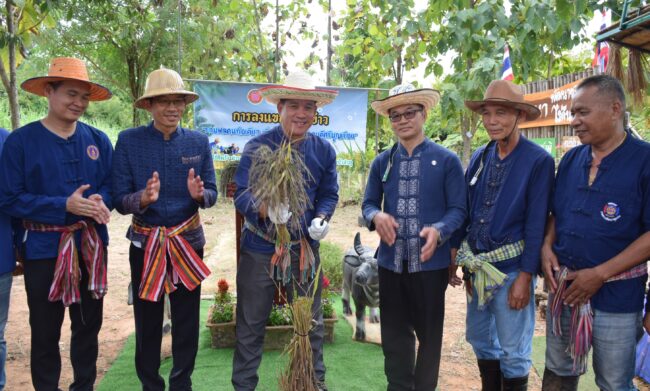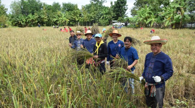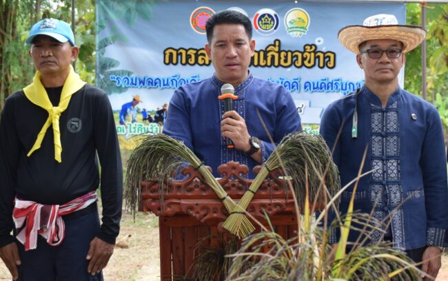 เมื่อวันที่ 6 พฤศจิกายน 2568 ณ ไร่คืนรัง บ้านนาแพง ต.ศรีบุญเรือง อ.ศรีบุญเรือง จังหวัดหนองบัวลำภู อำเภอศรีบุญเรือง โดยสำนักงานเกษตรอำเภอศรีบุญเรือง ร่วมกับ ศูนย์เรียนรู้เพิ่มประสิทธิภาพการผลิตด้านการเกษตร(โคกหนองนา) ของนางธัณญพร – ร้อยตำรวจโท ศุภวัฒน์ เวียงวงษ์ เกษตรกรต้นแบบ จัดกิจกรรมลงแขกเกี่ยวข้าว “รวมพลคนถือเคียว เกี่ยวข้าวสามัคคี คนดีศรีบุญเรือง” ขึ้นในวันนี้ก่อนอิทธิพลของพายุ “คัลแมกี” จะมีพายุฝนตกหนักทางภาคอีสาน อาจทำให้เกิดน้ำท่วมฉับพลันและน้ำป่าไหลหลากได้ โดยมี นายเพทาย จรกระโทก นายอำเภอศรีบุญเรือง เป็นประธานเปิดกิจกรรม พร้อมด้วย พัฒนาการอำเภอศรีบุญเรือง สาธารณสุขอำเภอศรีบุญเรือง รอง นายก อบต.ศรีบุญเรือง รอง ผกก.สภ.ศรีบุญเรือง จิตอาสาพระราชทาน ชุดตำรวจชุนสัมพันธ์ เยาวชน-ประชาชนค่ายคนดีศรีบุญเรือง และผู้นำชุมชนในพื้นที่
