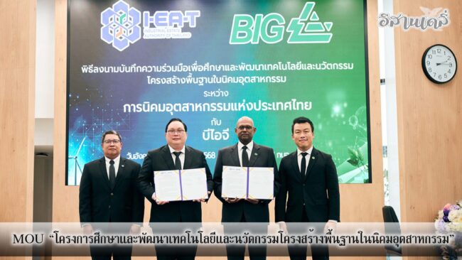 การนิคมอุตสาหกรรมแห่งประเทศไทย (กนอ.) และ บีไอจี ได้ลงนามในบันทึกความร่วมมือ (MOU) “โครงการศึกษาและพัฒนาเทคโนโลยีและนวัตกรรมโครงสร้างพื้นฐานในนิคมอุตสาหกรรม” ผนึกกำลังส่งเสริมและพัฒนาอนาคตอุตสาหกรรมไทยให้เติบโตอย่างยั่งยืนเป็นมิตรต่อสิ่งแวดล้อม พิธีลงนามจัดขึ้นในวันที่ 4 พฤศจิกายน 2568 ณ การนิคมอุตสาหกรรมแห่งประเทศไทย สำนักงานใหญ่ โดยมีนายสุเมธ ตั้งประเสริฐ ผู้ว่าการ การนิคมอุตสาหกรรมแห่งประเทศไทย (กนอ.)และนายรามานี เวลู กรรมการผู้จัดการ บีไอจี เป็นผู้ลงนาม