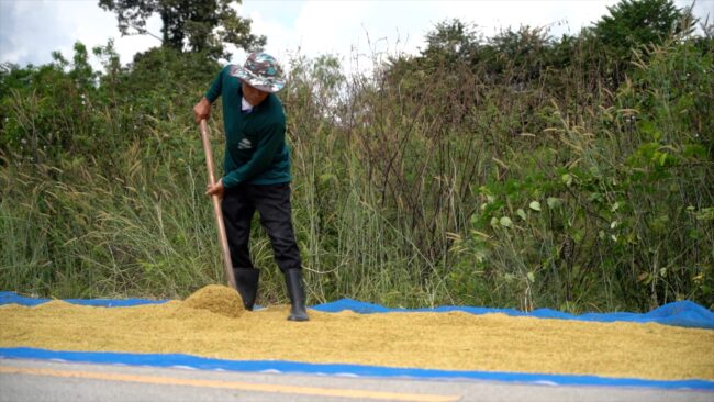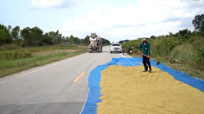 ชาวนาตากข้าวบนถนนขอความเห็นใจประชาชนที่สัญจรผ่านทาง หลังไม่มีที่จะตากข้าว วอนรัฐบาลเร่งประกาศราคาข้าวนาปีเพียงกิโลกรัมละ 5-6 บาท