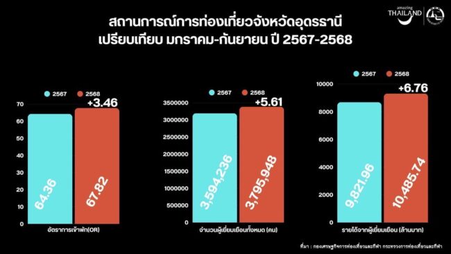 จากตัวเลขสถานการณ์ด้านสถิติการท่องเที่ยวจังหวัดอุดรธานี เปรียบเทียบ มกราคม-กันยายน ปี 2567 และ 2568 (ที่มา : กองเศรษฐกิจการท่องเที่ยวและกีฬา กระทรวงการท่องเที่ยวและกีฬา) เห็นได้ว่า อัตราการเข้าพัก(OR) ปี 2567= 64.36% ปี 2568 = 67.82% เพิ่มขึ้น +3.46% จำนวนผู้เยี่ยมเยือนทั้งหมด ปี 2567= 3,594,236 คน ปี 2568 = 3,795,948 คน เพิ่มขึ้น +5.61% และรายได้จากผู้เยี่ยมเยือน ปี 2567= 9,821.96 ล้านบาท ปี 2568 = 10,485.74 ล้านบาท เพิ่มขึ้น +6.76% ทำให้มั่นใจได้ว่าจะมีนักท่องเที่ยวเดินทางมาจังหวัดอุดรธานีเพิ่มขึ้นส่งผลให้เกิดรายได้ที่สอดรับกับนโยบายรัฐบาลที่ตั้งเป้าหมายไว้อย่างแน่นอน